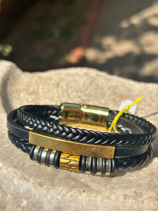 Mens Leather Bracelet | Braided with Gold Bar Charm