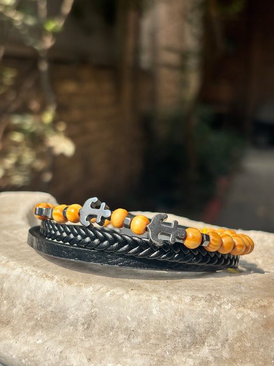 Mens Leather Bracelet | Multi Braided Strap Anchor Beads Leather Bracelet