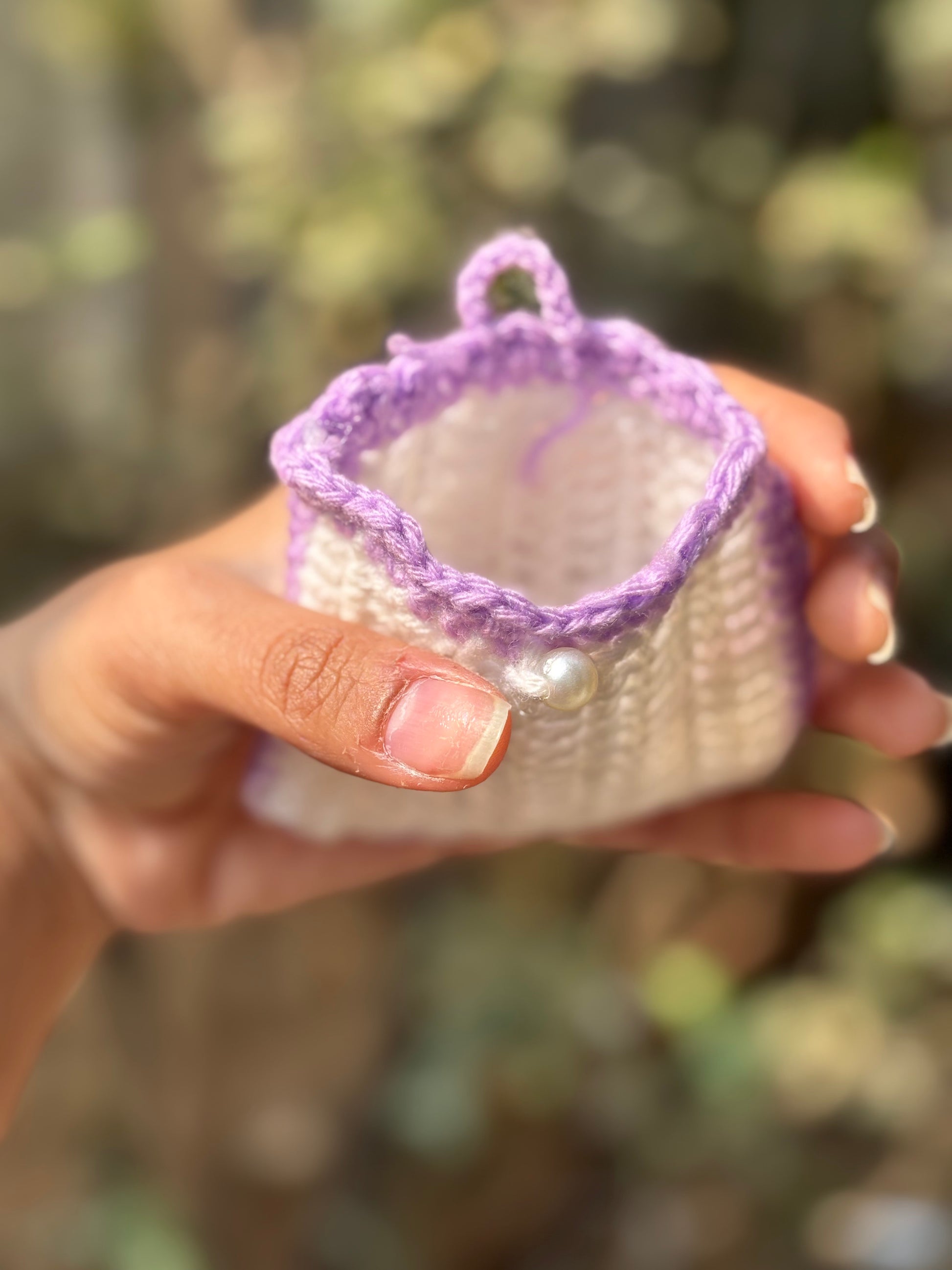 Cute, soft, and beautifully handmade, this white crochet pods pouch with a lavender border is perfect for storing your earbuds, coins, or small essentials. Lightweight and compact, it protects your pods while adding a soft handmade touch to your bag or keys. A lovely everyday accessory and a perfect small gift.