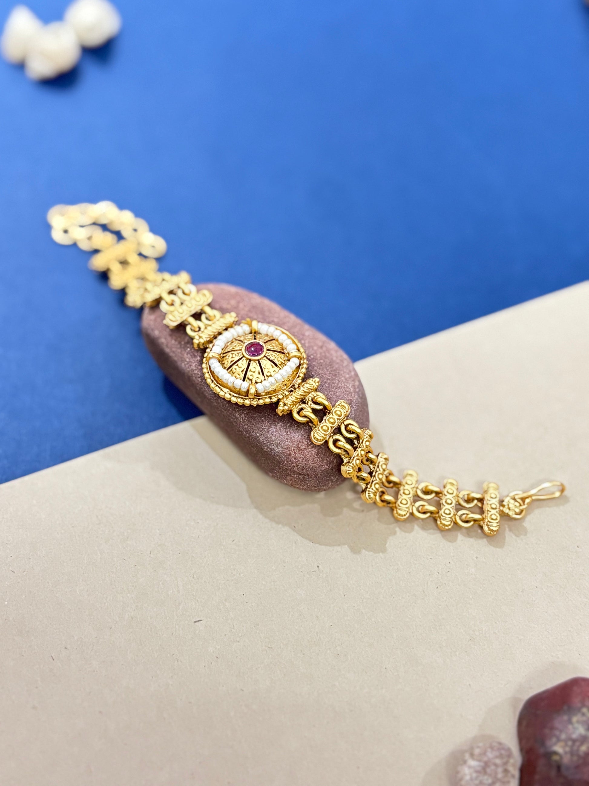 The Gold Plated Pearl & Ruby Stone Bracelet is a stunning blend of classic elegance and royal charm, designed for those who appreciate heritage-inspired jewellery. Adorned with lustrous pearls and a radiant ruby stone, this bracelet adds a touch of sophistication to festive, bridal, and party looks. The premium gold plating ensures a long-lasting shine, making it a timeless addition to your jewellery collection. Whether worn alone or paired with other accessories, it brings a graceful, regal appeal to any outfit.