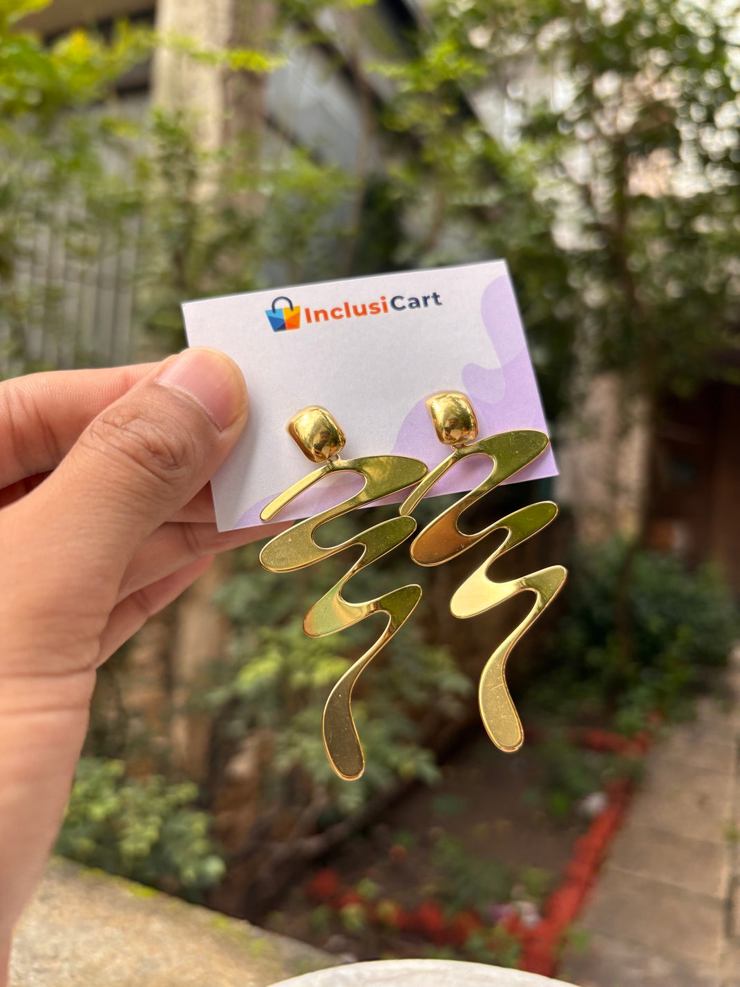 Stand out with our Golden Abstract Wave Anti Tarnish Earrings, designed for women who love statement-making jewelry. Featuring a bold wavy silhouette with a high-shine golden finish, these earrings bring a modern, artsy touch to any look.