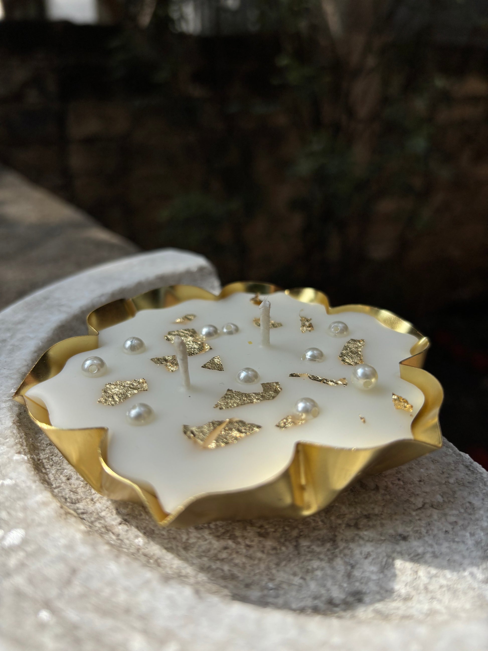 Add a touch of luxury to your décor with the Pearl Golden Work Beads Urli Scented Candle – Small 1. Handcrafted with elegant pearl and golden bead detailing, this small urli candle brings a soothing fragrance and a rich aesthetic — perfect for gifting or festive home styling.